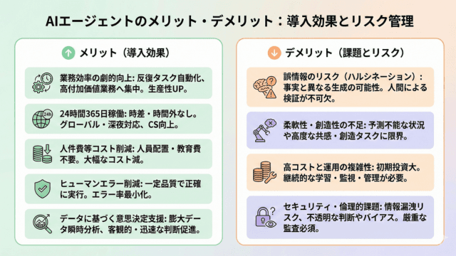 AIエージェントの導入は、業務効率の劇的な向上、コスト削減、そして競争力の強化という具体的なメリットを企業にもたらします。しかしながら、その導入にあたっては、ハルシネーションなどのリスクに対する適切な設計と、人間による監視・フィードバックの仕組みの構築が不可欠です。