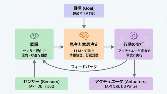 AIエージェントは、以下の四つの基本的な要素で構成される、「センサー→思考→アクチュエータ」のフィードバックループを回します。