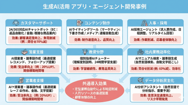 生成AIを活用したアプリ・エージェント開発は、さまざまな業界で実際に導入され、顕著な成果を上げています。ここでは、代表的な活用事例を紹介し、それぞれがどのような効果をもたらしているかを解説します。