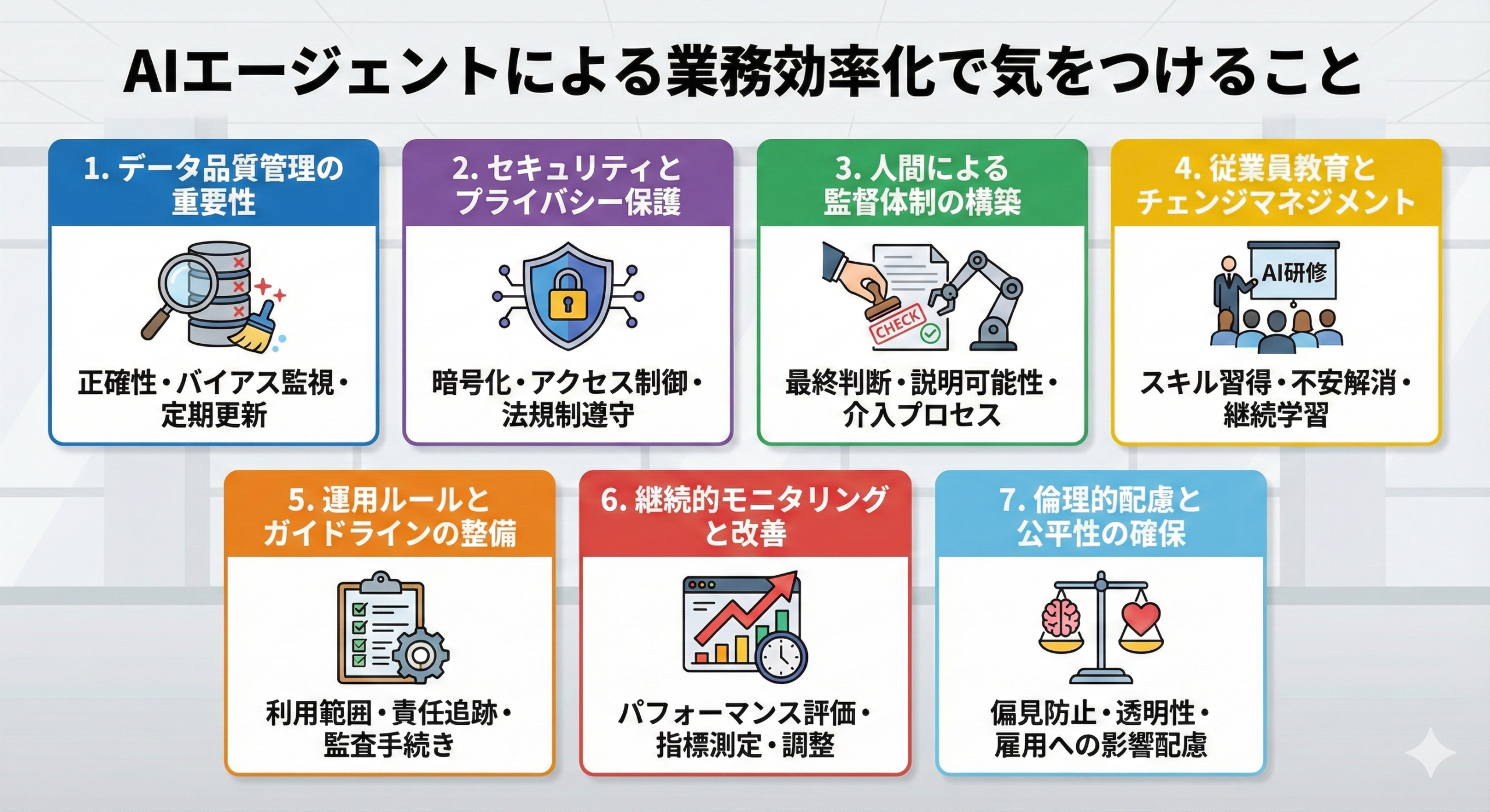 AIエージェントによる業務効率化は多くのメリットをもたらしますが、導入や運用にあたってはいくつかの重要な注意点があります。これらを理解し適切に対応することで、AIエージェントの効果を最大限に引き出すことができます。