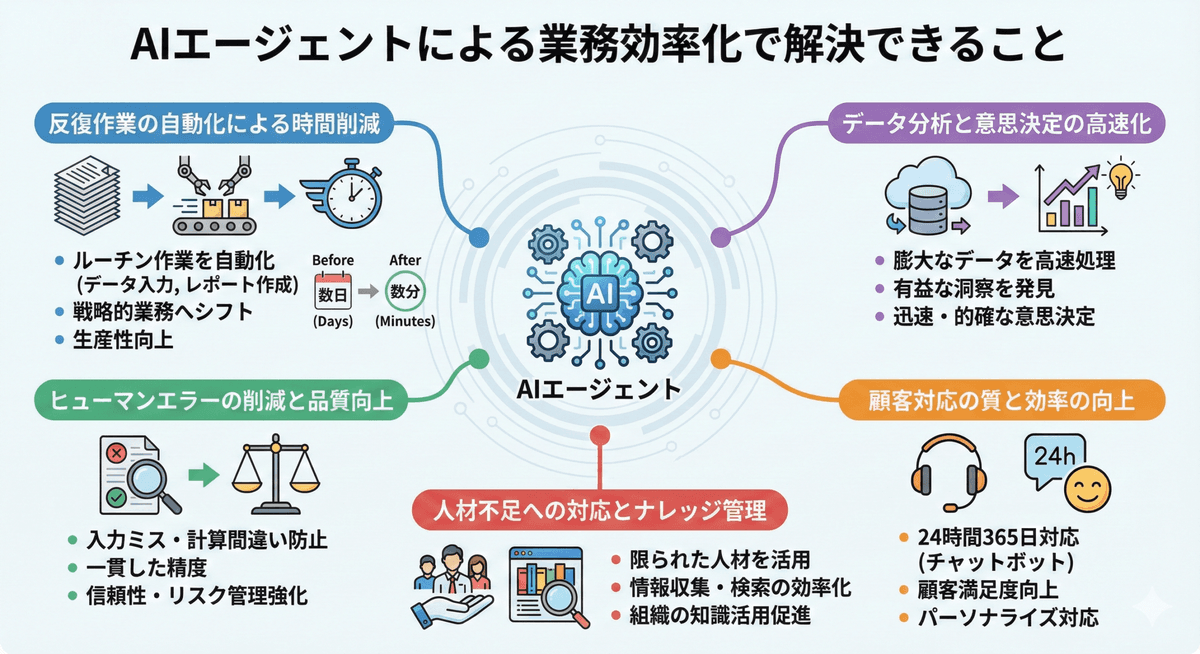 このように、AIエージェントによる業務効率化は、単なる作業の自動化にとどまらず、従業員がより価値の高い業務に集中できる環境を作り出し、企業全体の競争力強化に大きく寄与する重要な取り組みとなっています。