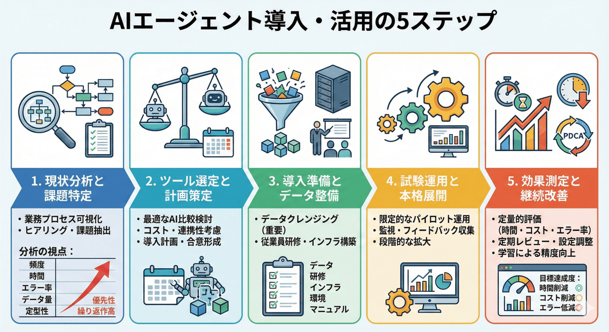 AIエージェントによる業務効率化を成功させるためには、計画的かつ段階的なアプローチが重要です。ここでは、導入から運用までの具体的な手順を解説します。