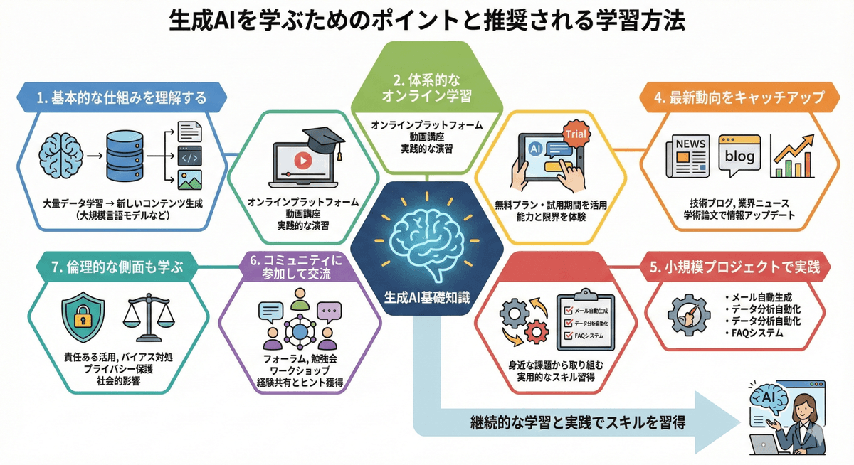 AIエージェントを効果的に活用するためには、生成AIの基礎知識を身につけることが重要です。ここでは、これから生成AIを学びたい方に向けて、学習のポイントと推奨される学習方法をご紹介します。