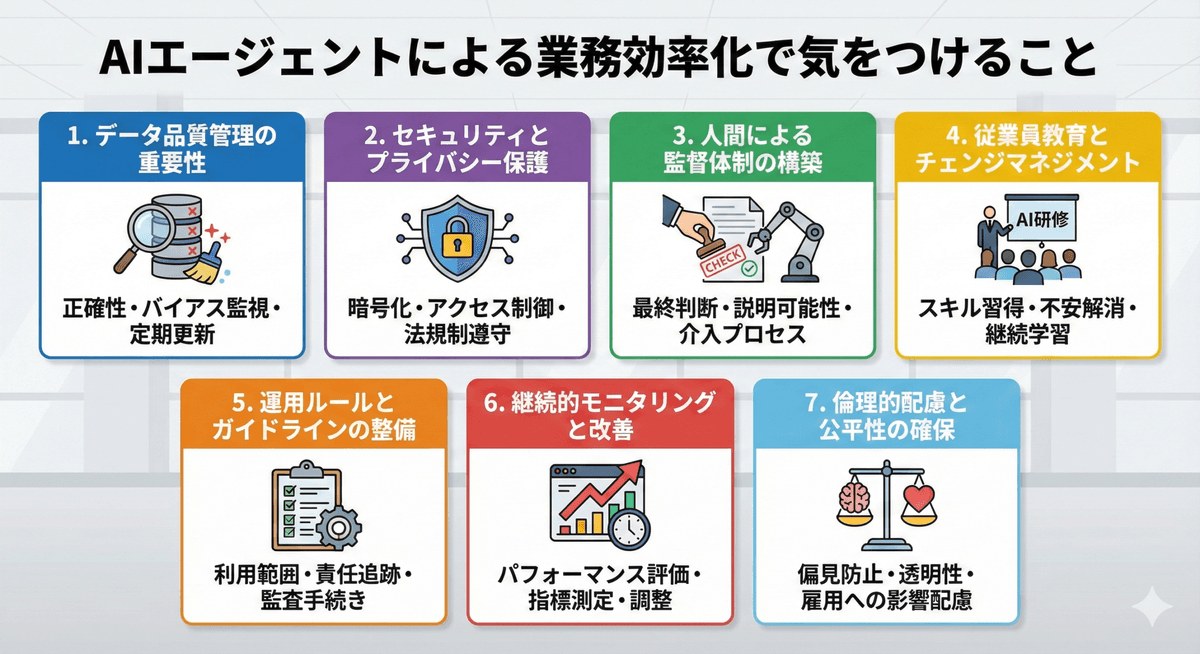 一方で、AIエージェントの導入には注意すべき点も多くあります。データの品質管理、セキュリティとプライバシーの保護、AIの判断に対する人間による監督、従業員への十分な教育とトレーニング、明確な運用ルールの整備など、これらを怠ると期待した効果が得られないばかりか、かえって業務に悪影響を及ぼす可能性があります。また、倫理的な配慮や公平性の確保も、持続可能なAI活用には欠かせない要素です。