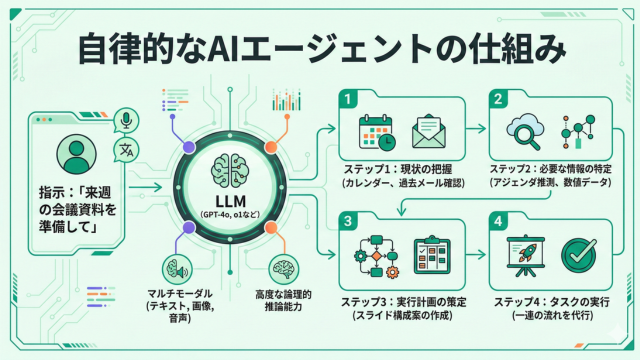 AIエージェントは、この推論能力を使い「ステップ1:現状の把握」「ステップ2:必要な情報の特定」「ステップ3:実行計画の策定」「ステップ4:タスクの実行」というプロセスを瞬時に回します。例えば、「来週の会議の資料を準備して」という指示に対し、カレンダーを確認し、過去のメールからアジェンダを推測し、関連する数値をデータから抽出してスライドの構成案を作成する、といった一連の流れを代行できるのがAIエージェントの真髄です。