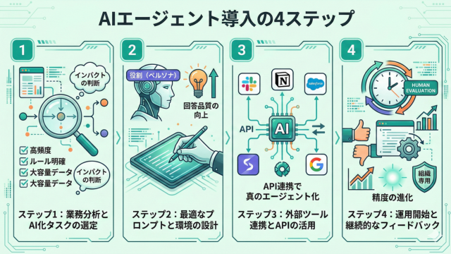 AIエージェントを効果的に導入するためには、場当たり的な利用ではなく、論理的なステップを踏む必要があります。