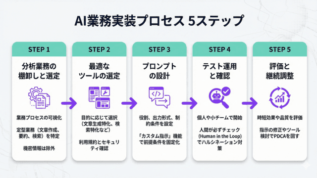 AIエージェントを無料で活用し、業務効率化を確実に成功させるためには、単にツールを導入するだけでなく、適切な手順に沿ってプロセスを構築することが不可欠です。無料のAIサービスは手軽に始められる反面、機能制限やセキュリティ面での配慮も必要なため、戦略的なステップを踏むことが、後の成果に大きく影響します。