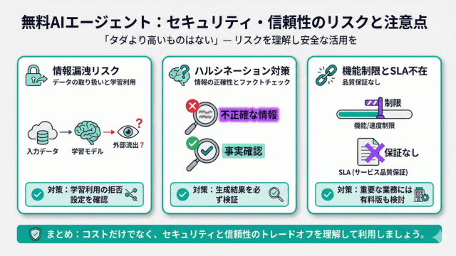 AIエージェントを無料で利用することは、ビジネスを加速させる強力な手段である一方、その裏側には見落としがちなリスクや落とし穴も潜んでいます。「タダより高いものはない」という言葉があるように、コストがかからないからといって仕組みを理解せずに無防備に利用してしまうと、予期せぬ情報漏洩やトラブルを招く可能性があります。