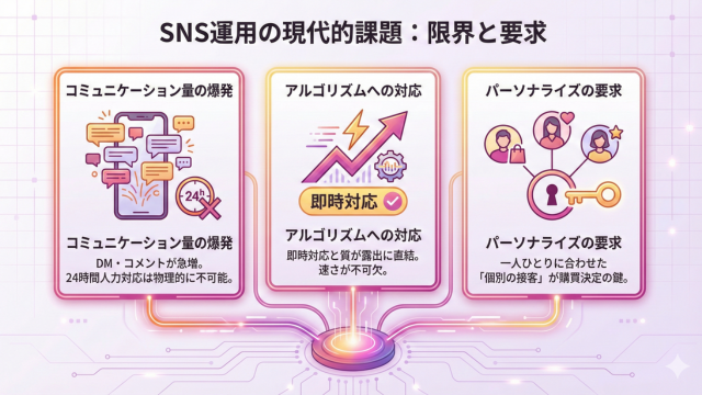 - コミュニケーション量の爆発: DM(ダイレクトメッセージ)やコメントが増え続け、人間による24時間対応が物理的に不可能になった。