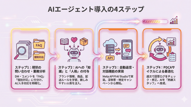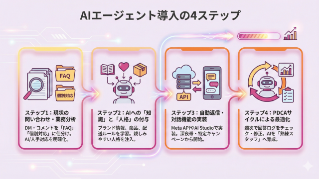 Meta公式のAPIや、提携しているAIプラットフォーム(AI Studio等)を通じて機能を実装します。まずは特定のキャンペーンや、深夜帯の自動返信からスタートするのが安全です。