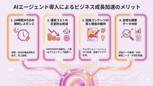 AIエージェントを導入することで、人的リソースの削減だけでなく、ビジネスの成長を加速させる複数のメリットを享受できます。