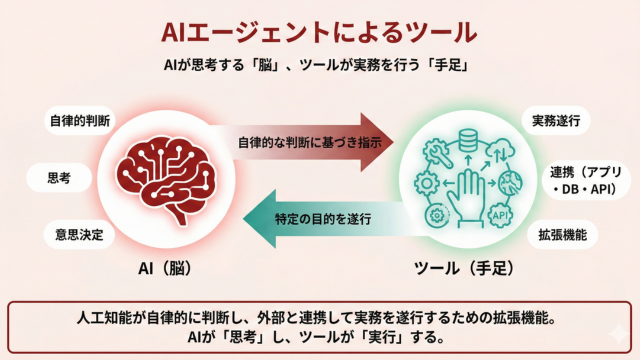 AIエージェントによるツールとは、人工知能が自律的に判断し、外部のアプリケーションやデータベース、APIなどと連携して特定の目的を遂行するための拡張機能を指します。いわば、AIが思考する「脳」であるならば、ツールは実務を行う「手足」の役割を担っています。
