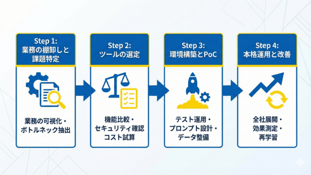 | Step 3 | 環境構築とPoC | テスト運用、プロンプト設計、データ整備 | 小規模スタートで効果検証を行う |
