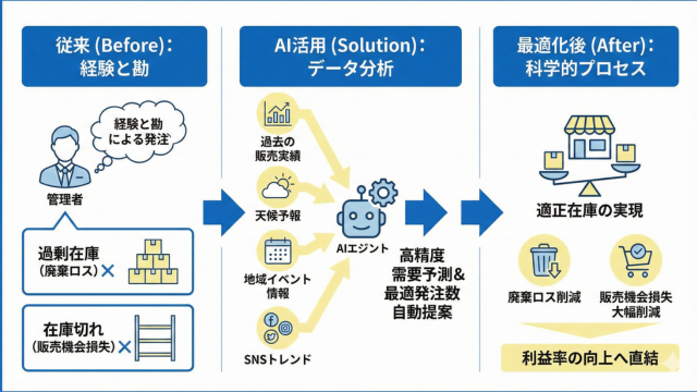 AIはこれらの複雑なデータから需要の変動パターンを高精度に予測し、店舗ごとの最適な発注数を自動的に提案します。従来、ベテラン店長の「経験と勘」に頼っていた発注業務がデータに基づいた科学的なプロセスへと変化したことで、過剰在庫による廃棄ロスや、人気商品の在庫切れによる販売機会の損失が大幅に削減されました。