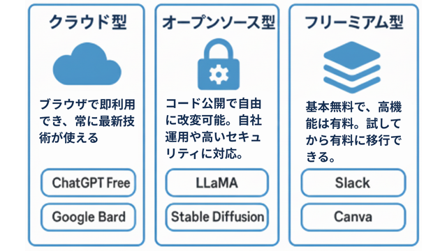 ウェブブラウザからアクセスするだけで利用できる形態です。インストールや複雑な設定が不要で、インターネット接続があればどこからでも利用できます。代表的なサービスには、ChatGPT Free、Google Bard、Claude、Notion AIなどがあります。このモデルの利点は、すぐに利用開始できることと、常に最新バージョンのAI技術を使用できることです。