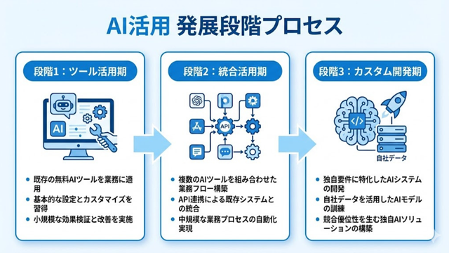 無料AIエージェントでの基礎的な経験を積んだ後、より高度なカスタム開発へと発展させる道筋を解説します。