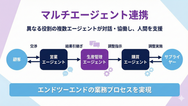 異なる目的や役割をもつ複数のエージェントが対話しながら人間を支援する「マルチエージェント」という概念も重要な機能の一つです。複数のAIエージェントが協働して業務を処理する環境が構築されており、営業エージェントが顧客との交渉を行い、その結果を生産管理エージェントに引き継ぎ、さらに購買エージェントがサプライヤーとの調整を実施するといった、エンドツーエンドの業務プロセスを実現できます。