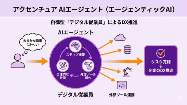 アクセンチュアが提供するAIエージェントは、近年注目されている「エージェンティックAI」の概念を具現化したものです。これは、人間からの大まかな指示(ゴール)に対し、それを達成するためのステップを自ら構築し、必要に応じて外部ツールを操作しながらタスクを完結させる自律型のシステムを指します。企業のデジタル変革(DX)を推進する上での「デジタル従業員」としての役割を担います。