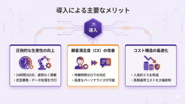- 顧客満足度(CX)の改善: 待機時間ゼロでの高度なパーソナライズ対応が可能になります。