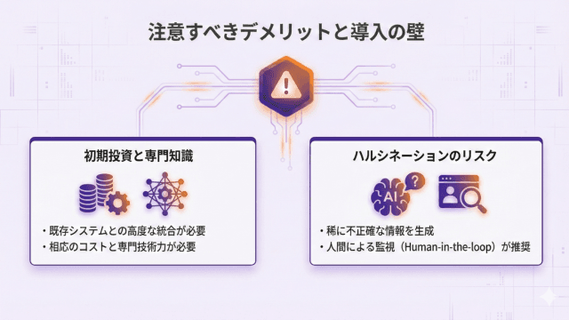 - 初期投資と専門知識: 既存システムとの高度な統合が必要なため、導入には相応のコストと専門的な技術力が必要です。
