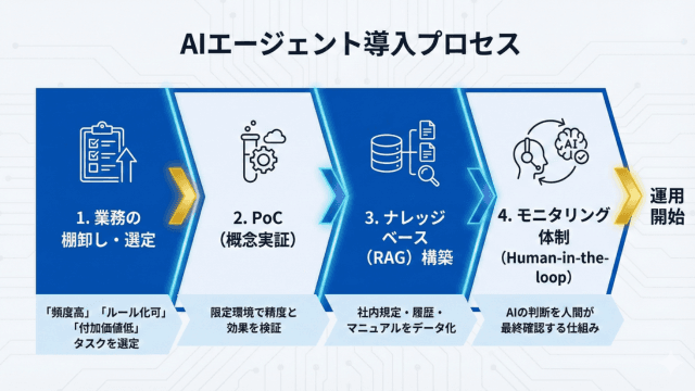 AIエージェントの導入は、一度設定して終わりではありません。以下の4ステップで段階的に進めることが、ROI(投資対効果)を最大化する近道です。