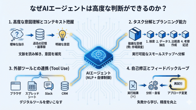 なぜAIエージェントはこれほどまでに高度な判断ができるのでしょうか。その裏側には、最先端の自然言語処理(NLP)と自律制御アルゴリズムが組み合わさった4つの柱があります。