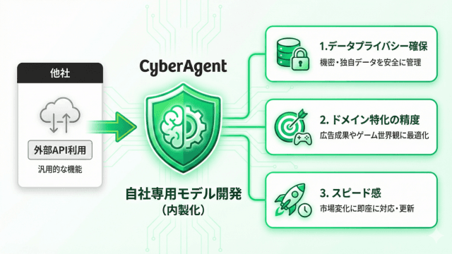 多くの企業が外部のAPIを利用する中で、サイバーエージェントは「自社専用モデルの開発(内製化)」に注力しています。これには明確な戦略的理由があります。