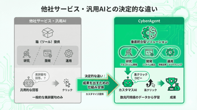 サイバーエージェントの強みは、AIのアルゴリズム開発(研究)、それをシステムに組み込むエンジニアリング(開発)、そして実際に現場で使いこなすマーケティング(運用)が三位一体となっている点です。多くの他社サービスが「箱(ツール)」だけを提供するのに対し、サイバーエージェントは「成果を出すための仕組み」全体をカスタマイズして提供します。
