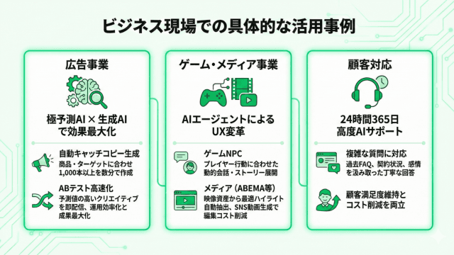 ゲーム開発においては、ノンプレイヤーキャラクター(NPC)に生成AIを搭載し、プレイヤーの行動に合わせた動的な会話やストーリー展開を導入しています。また、メディア事業(ABEMA等)では、膨大な映像資産から最適なハイライトシーンを自動抽出し、SNS投稿用動画を生成するなど、編集コストの削減に大きく寄与しています。