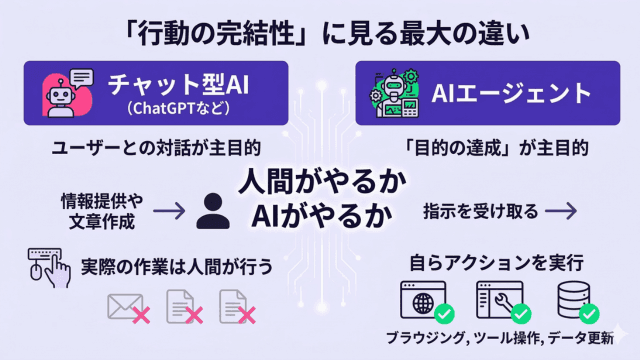 - AIエージェント: 「目的の達成」が主目的。対話はあくまで指示の受け取り手段であり、実際のアクション(ブラウジング、ツール操作、データ更新)を自ら実行する。