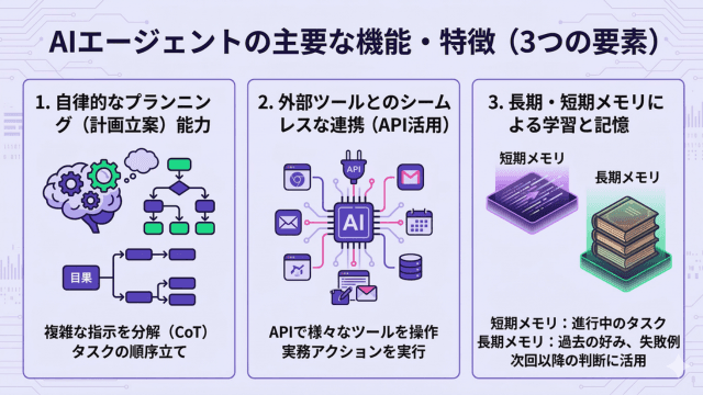AIエージェントが自律的に動くためには、主に以下の3つの要素が組み合わさっています。