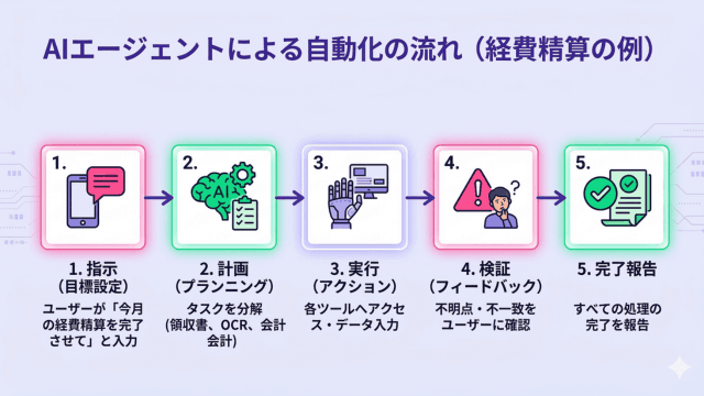 - 指示(目標設定): ユーザーが「今月の経費精算を完了させて」と入力。