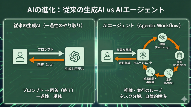 従来の生成AIは「プロンプトに対して1つの回答を返す」一過性のやり取りが主でした。一方でAIエージェントは、「推論(Reasoning)」と「実行(Acting)」のループを繰り返します。これを「Agentic Workflow」と呼び、複雑な目標を小さなタスクに分解して自律的に解決していくのが特徴です。