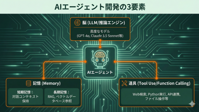 AIエージェントを開発するためには、単なるLLMのAPI利用だけでなく、以下の3つの要素を統合する必要があります。