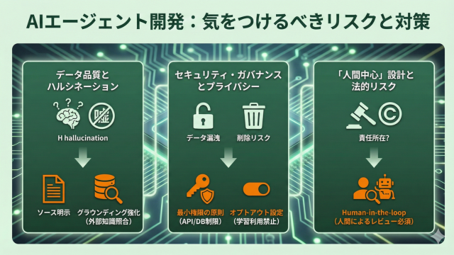 「もっともらしい嘘(ハルシネーション)」は依然としてリスクです。これを防ぐためには、AIが回答の根拠としたソース(出典)を明示させる設計や、グラウンディング(外部知識との照合)の強化が必須です。