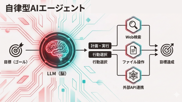 開発会社が構築するAIエージェントとは、大規模言語モデル(LLM)を「脳」として持ち、与えられた目標(ゴール)に対して最適な手順を自ら計画・実行するソフトウェアです。単に問いに答えるだけでなく、Web検索、ファイルの読み書き、外部APIの叩き込みなど、目標達成に必要な「行動」を自律的に選択します。
