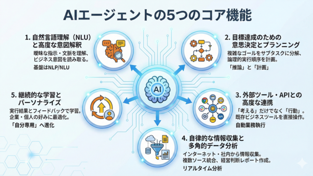 AIエージェントが従来のプログラムや単純なAIと一線を画すのは、以下の5つの高度な機能が統合されているからです。
