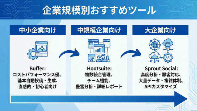 中規模企業向け:Hootsuiteは、複数のSNSプラットフォームを統合管理でき、チーム機能も充実しています。分析機能が豊富で、詳細なレポート作成が可能です。