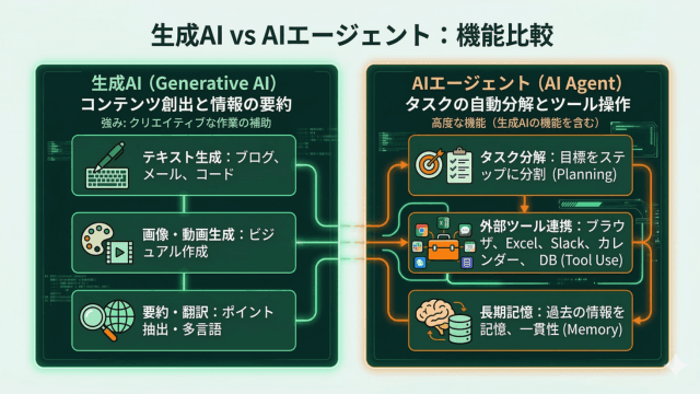 | 主な役割 | コンテンツの生成・回答 | タスクの実行・完遂 |