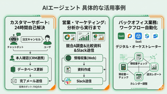 従来のボットはFAQを返すだけでしたが、AIエージェントは「注文をキャンセルしたい」という要望に対し、CRM(顧客管理システム)と連携して本人確認を行い、データベースの注文ステータスを書き換えた上で、完了メールを送信するところまで自動で行います。