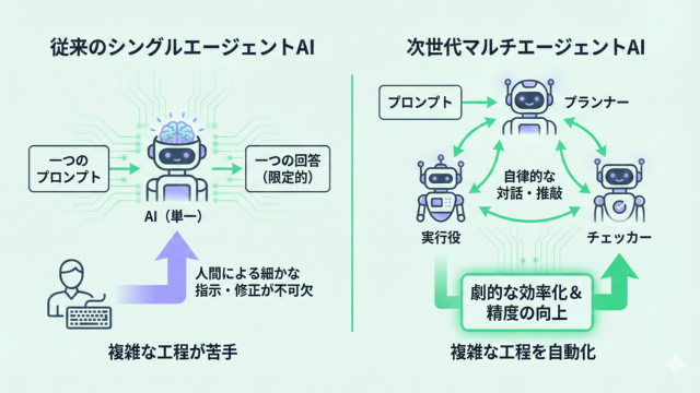 従来の単一AI(シングルエージェント)では、一つのプロンプトに対して一つの回答を得るのが限界であり、複雑な工程を要する業務では人間による細かな指示や修正が不可欠でした。しかし、マルチエージェントAIはこの限界を打破します。各エージェントが「プランナー」「チェッカー」「実行役」といった特定の役割を持ち、自律的に対話・推敲を重ねることで、劇的な効率化と精度の向上が期待されています。
