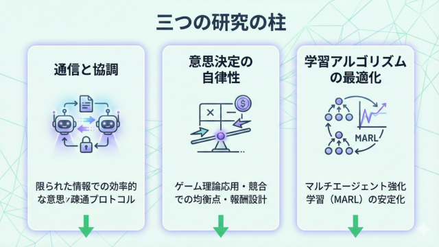 マルチエージェントAIの研究領域は、複数の自律的なエージェントがいかにして「全体としての最適解」を導き出すかというメカニズムの解明に重点を置いています。
