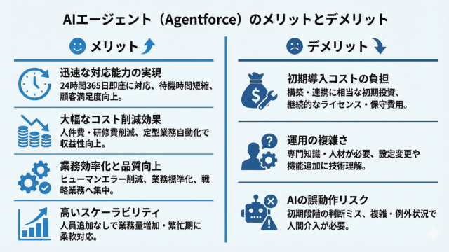 最も大きなメリットは、24時間365日稼働による迅速な対応能力です。従来の人間による対応では、営業時間外や休日に顧客対応ができませんでしたが、Agentforceは顧客からの問い合わせに即座に対応できます。これにより、顧客の待機時間を大幅に短縮し、顧客満足度の向上を実現できます。