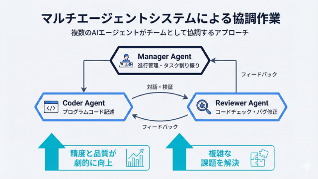近年特に注目を集めているのが「マルチエージェントシステム」の研究です。これは、単一のAIですべてを処理するのではなく、以下のように異なる役割を持たせた複数のAIエージェントをチームとして協調させるアプローチです。