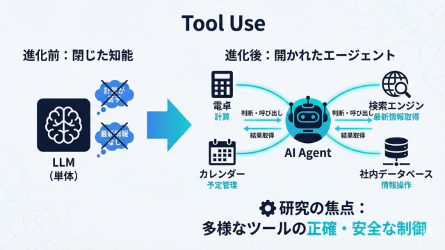 「ツール利用(Tool Use)」に関する研究も急速に進展しています。LLM単体では計算が苦手だったり、最新のニュースを知らなかったりするという弱点があります。そこで、AIエージェントが自らの判断で電卓アプリ、検索エンジン、カレンダー、社内データベースなどの外部ツール(API)を呼び出し、必要な情報を取得したり操作を実行したりする仕組みが開発されています。AIは「閉じた知能」から、デジタル空間上のあらゆるリソースを使いこなす「開かれたエージェント」へと進化しており、研究の焦点は、いかに多様なツールを正確かつ安全に制御させるかという点に移っています。